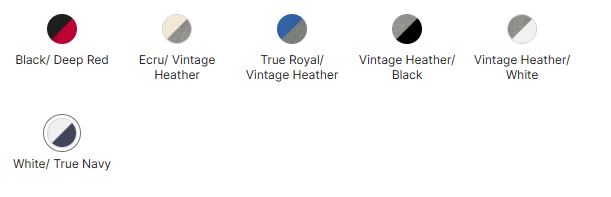 | Color | Black/Deep Red, Ecru/Vintage Heather, True Royal/Vintage Heather, Vintage Heather/Black, Wintage Heather/White, White/Navy |